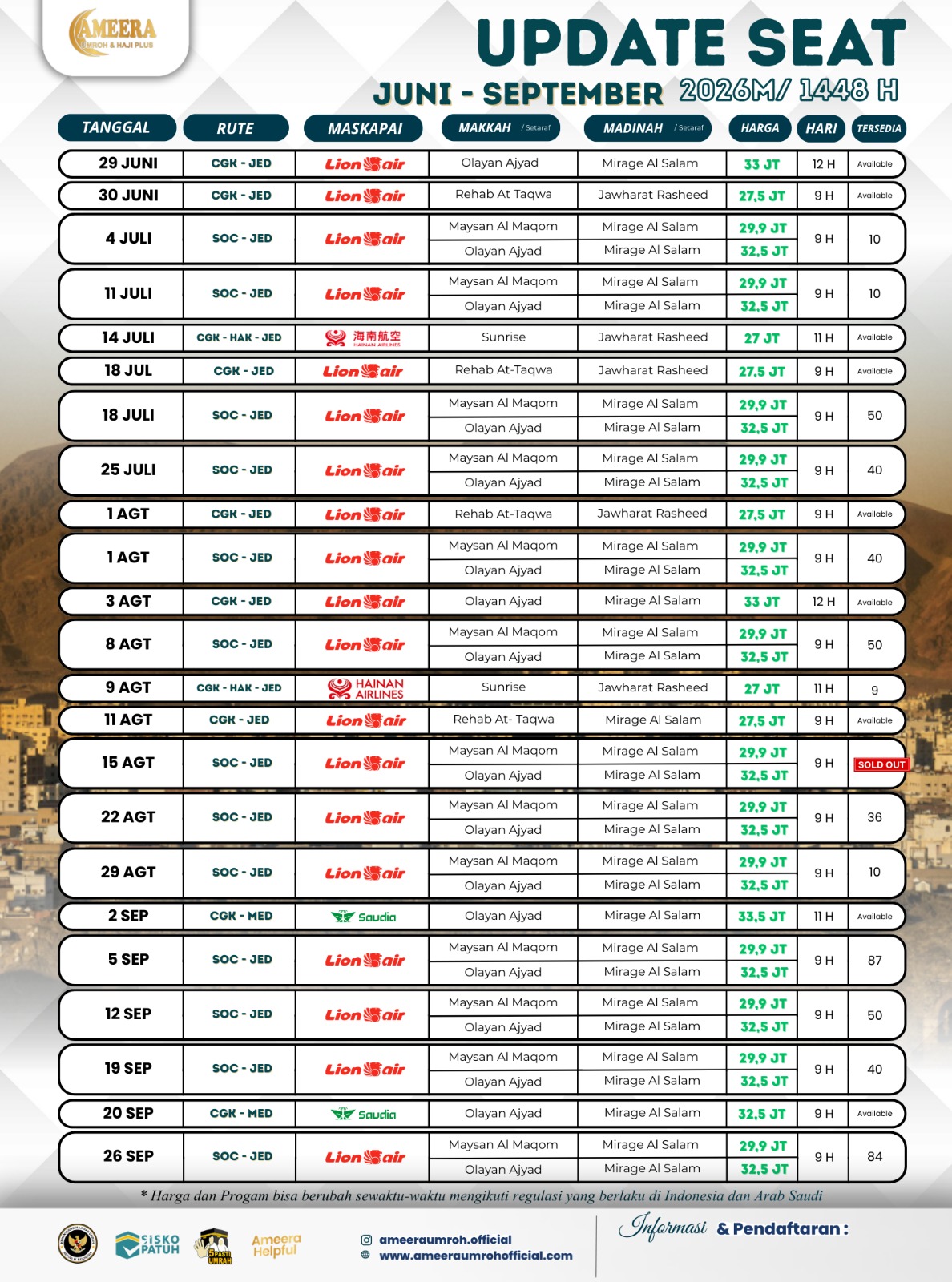 Bagi Anda yang sedang merencanakan perjalanan ibadah ke Tanah Suci, informasi update seat Umroh 2026 ini sangat penting untuk diperhatikan. Saat ini, jadwal keberangkatan Umroh Juni hingga September 2026 (1448 H) sudah tersedia dengan berbagai pilihan paket, maskapai, serta hotel yang nyaman di Makkah dan Madinah.